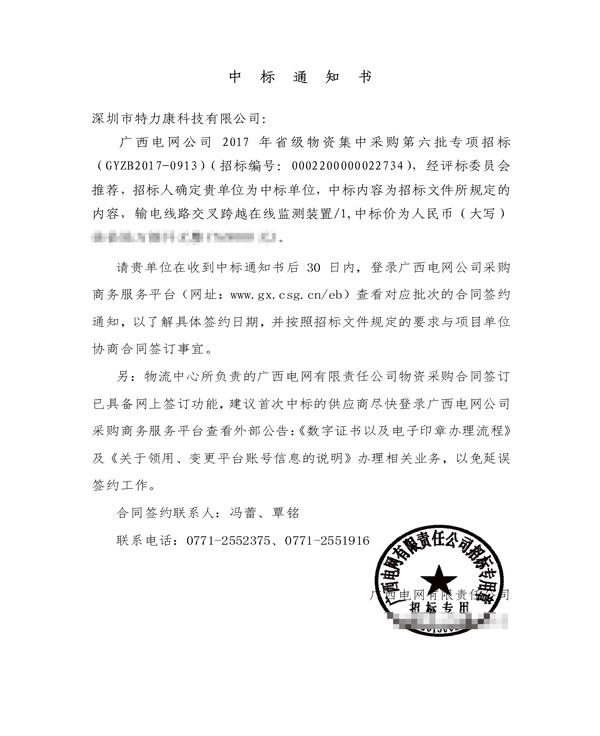 特力康中标国网黑龙江送变电工程公司的2024年度第18次物资类竞争性谈判采购项目——庆阳驱鸟器物资框 特力康中标国网甘肃省电力公司省管产业单位2024年第五次物资竞争性谈判授权采购项目 中标喜讯:深圳市特力康科技有限公司成功入围许继集团综合能源公司输电线路视频在线监测装置??榧上钅?/span> 中标喜讯:特力康成功中标国网重庆市电力公司渝中一片区项目 特力康成功中标国网天津市电力公司2024年第二次?物?资招标项目 特力康中标国网安徽省电力有限公司芜湖供电公司2024年3月非物质采购项目 特力康输电线路微波覆冰在线监测装置,守护湖北电网寒冬安全 特力康架空输电线路导线弧垂监测装置,守护湖北输电线路弧垂安全 特力康输电线路防外力破坏系统,为江西境内绵延的输电线路筑起“主动防护屏障”。 特力康北斗杆塔倾斜在线监测装置,守护山西电网杆塔稳定 特力康高压输电线路导线覆冰在线监测装置,为河南电网覆冰护航 鄂电稳线“哨兵”:特力康舞动监测装置守护超高压线路舞动安全 重庆变电站“防鸟卫士”:特力康一体化驱鸟器守护山城电网 特力康输电线路智能AI多目监控装置+倾斜监测守护山西输电生命线 鄂网“全景眼”:特力康一体化视频监控系统守护输电线路 山东电网 “稳塔哨兵”:特力康智能杆塔倾斜监测预警装置筑牢电力杆塔安全防线 宁夏配电线路安装了我司防外破电子化智能警示牌
