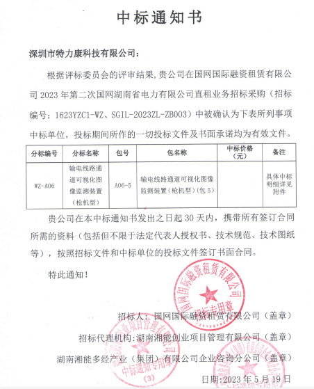 特力康中标2023年第二次国网湖南省电力有限公司直租业务招标采购可视化图像监测