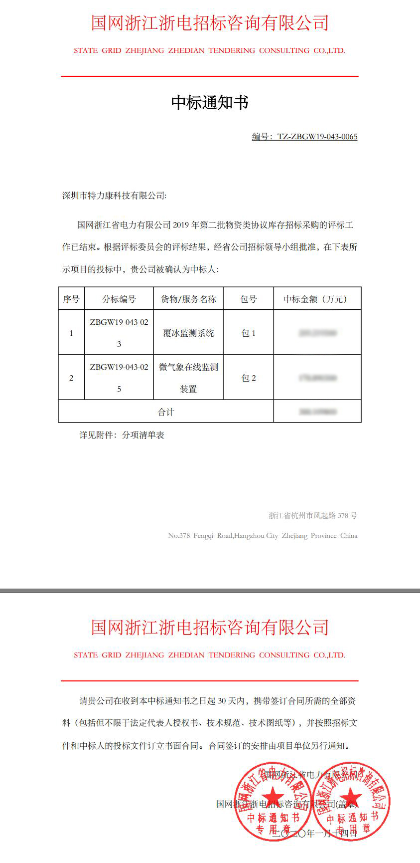 国网浙江省电力有限公司2019年第二批物资类协议库存招标采购的评标工作已结束。根据评标委员会的评标结果,经省公司招标领导小组批准,我司(深圳市特力康科技有限公司)中标ZBGW19-043-023覆冰监测系统包1及ZBGW19-043-025微气象在线监测包2两个标包,现附中标通知书如下: