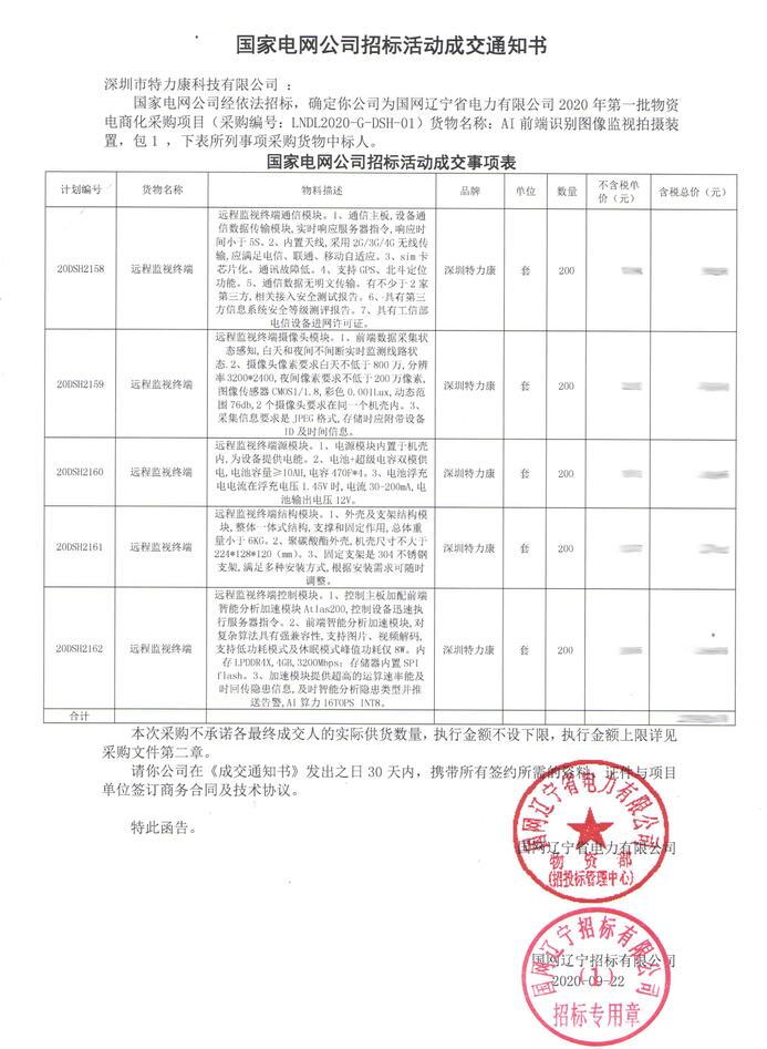国家电网公司经依法招标,确定我司(深圳市特力康科技有限公司)为国网辽宁省电力有限公司2020年第一批物资电商化采购项目(采购编号: LNDL2020-G- -DSH-01)货物名称: AI 前端识别图像监视拍摄装置,包1,下表所列事项采购货物中标人(附件如下)。