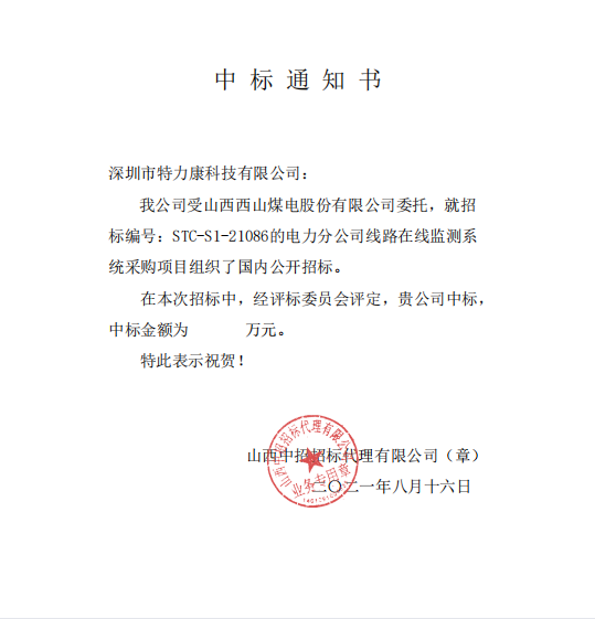 我公可受山西西山煤电股份有限公司委托,就招标编号:STC-S1-21086的电力分公司线路在线监测系统采购项目组织了国内公开招标。在本次招标中,经评标委员会评定,我司公司中标,中标公告如下: