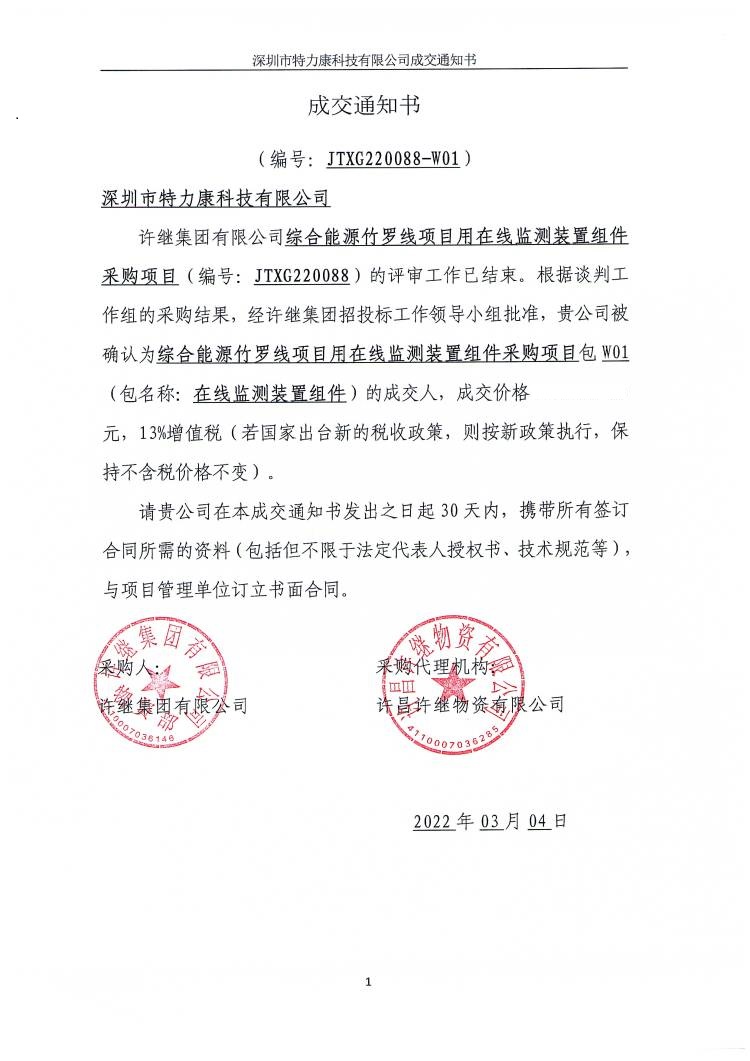 许继集团有限公司综合能源竹罗线项目用在线监测装置组件采购项且(编号: JTX6220088)的评审工作已结束。根据谈判工作组的采购结果,经许继集团招投标工作领导小组批准,贵公司被确认为综合能源竹罗线项且用在线监测装置组件采购项目包W01(包名称:在线监测装置组件)的成交人,成交通知如下: