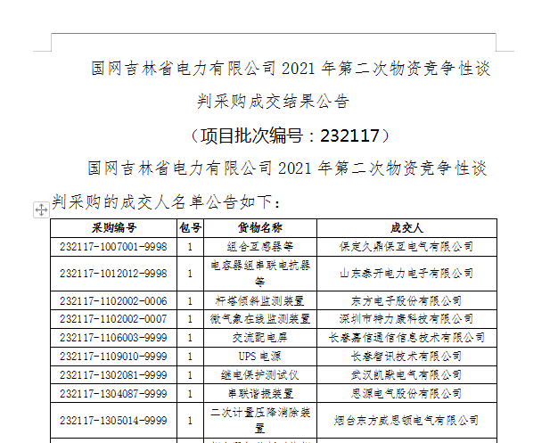 特力康中标国网吉林省电力有限公司2021年第二次物资竞争性谈判(项目批次编号: 232117)-微气象在线监测装置,国网吉林省电力有限公司2021年第二次物资竞争性谈判采购的成交人名单公告如下:
