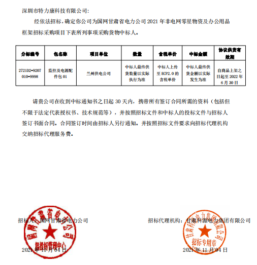 经依法招标。确定我司为国网甘肃省电力公司2021年+电网零星物资及办公用品框架招标采购项目下表所列事项采购贷物中标人。中标通知如下: