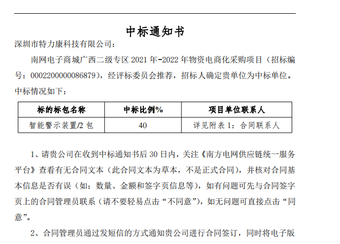 我司中标南网电子商城广西二级专区2021年-2022年物资电商化采购项目(招标编号: 0020000086879) - 智能警示装置,经评标委员会推荐,招标人确定我单位为中标单位。中标情况如下: