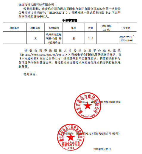 经依法招标,确定我司为湖北正源电力集团有限公司2022年第一次物资公开招标(招标编号: HBZYGS2211 ),测重观冰一体式监测终端包2下表所列事项采购货物中标人。中标通知如下:
